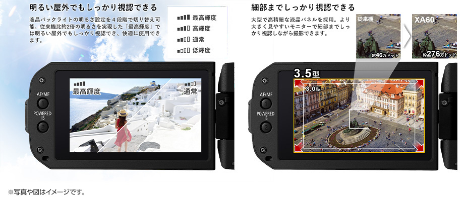 3.5型 約276万ドット相当LCDを搭載。液晶バックライトの明るさ設定が4段階になり従来機比で約2倍の明るさが選択可能です。