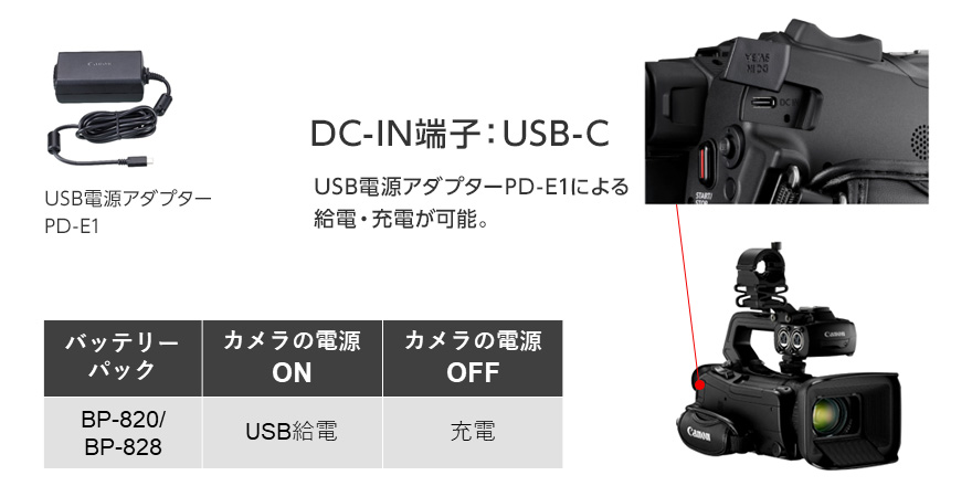 DC-INとしてUSB-C端子を採用し、USB電源アダプターPD-E1による給電・充電が可能です。カメラ電源ON時はカメラ本体へのUSB給電になり、電源OFF時は装着バッテリーへの充電に切り替わります。