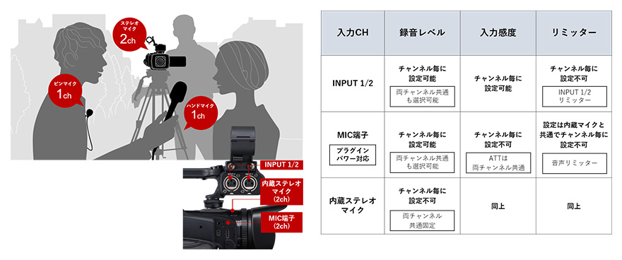 高音質リニアPCM 4chに対応。4chオーディオ独立設定を搭載し、録音レベル・入力感度・リミッターを設定できます。