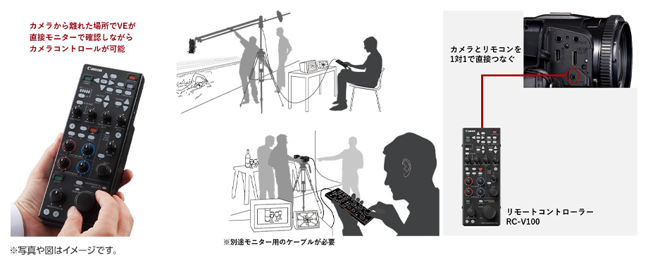 多機能リモートコントローラーRC-V100に対応。画質調整など主要な操作を離れた位置から設定可能で、クレーン撮影など遠隔操作時に活用できます。