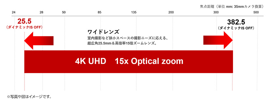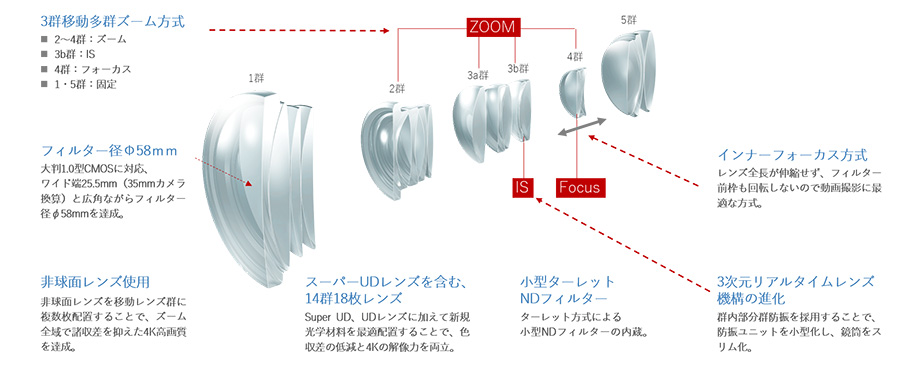 広角側25.5mmから望遠側382.5mmまでの15倍ズーム。多群ズーム方式を駆使することで、1.0型CMOSに対応しながらも、小型・スリム化した4K対応レンズです。