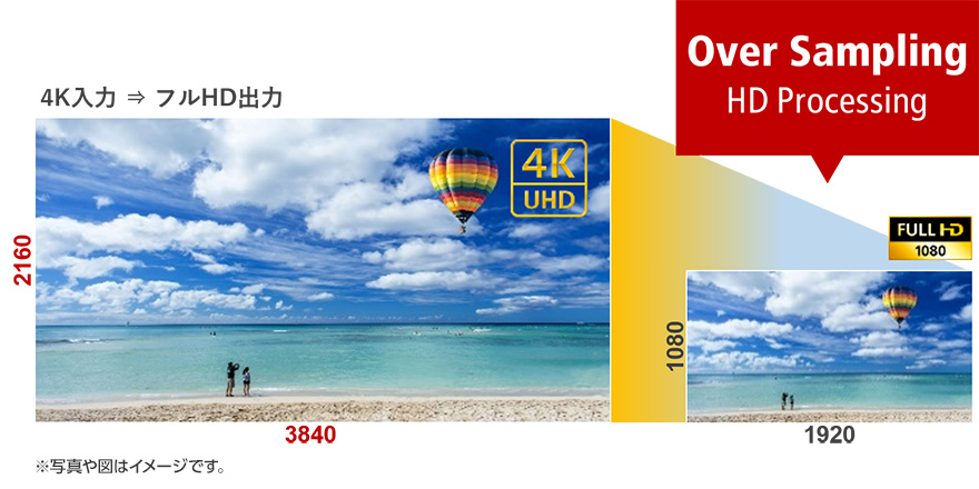 Over Sampling HD Processingは、4Kの豊かな映像表現力をフル HD記録に有効活用することで、高い解像度を誇るフルHD記録動画撮影を可能にします。