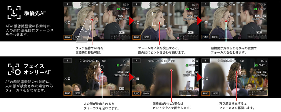 フレーム内に顔を検出すると、優先的にピントを合わせ続ける「顔優先AF」と、フレーム内に顔が検出された場合のみフォーカスを合わせる「顔限定AF」(フェイスオンリーAF)を用意しており、撮影シーンに応じて使い分けることで狙い通りのAFワークが可能になります。