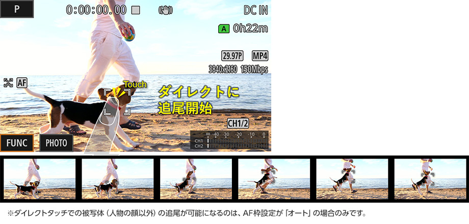 顔以外の被写体を追尾する場合は、画面に直接タッチするだけの簡単操作を実現。撮りたいシーンを逃さず記録することができます。