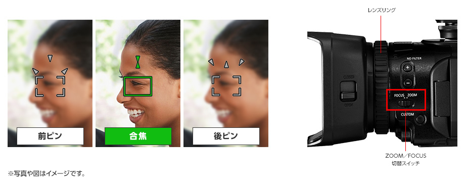 マニュアルフォーカス時のアシスト機能、「デュアルピクセルフォーカスガイド」は、合焦確認だけでなくピント位置の前ピン/後ピン情報まで視覚的に分かりやすく伝えるガイド機能です。シビアなフォーカス精度が求められる現場での合焦確認と、プッシュ/プルのフォーカスワークの判断を手助けします。