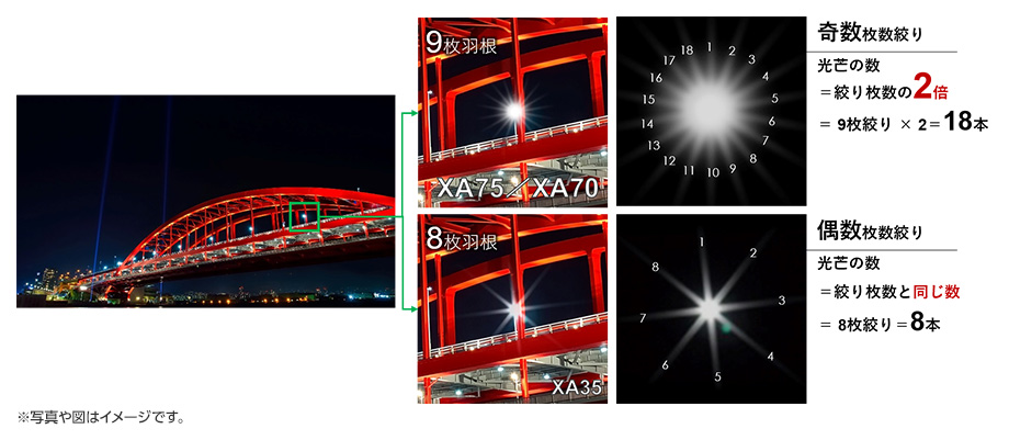 9枚の絞り羽根により、円形に近い美しく自然なボケ形状。また、多数且つ奇数枚の9枚のため、回折光が拡散し柔らかい光芒を実現します。