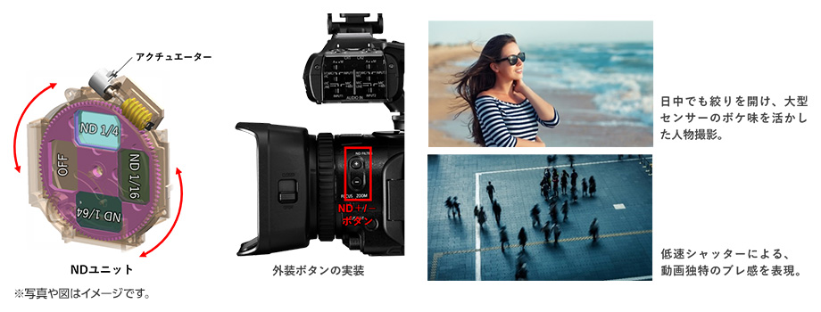 回転式ターレット方式を採用した小型独立3濃度(ND1/4/ND1/16/ND1/64/OFF)NDフィルターの内蔵化により利便性が向上。様々な照明環境における最適な露出表現が可能です。