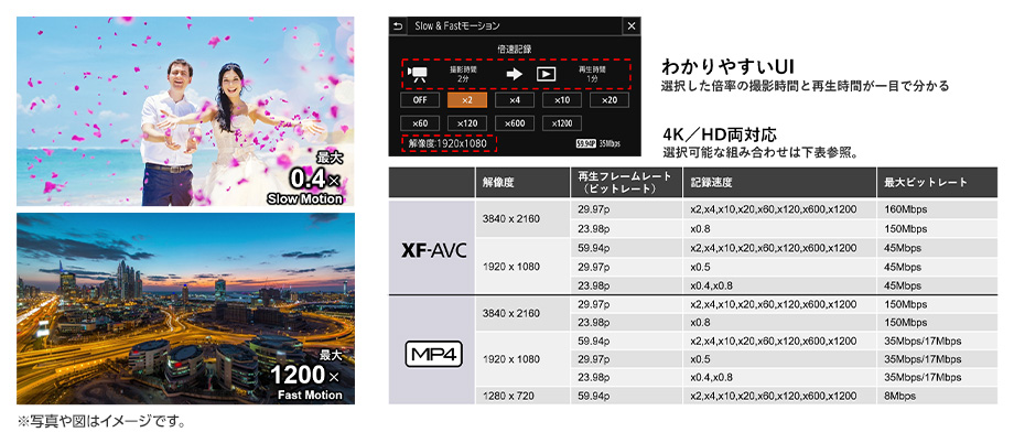 スローモーションで最大0.4倍速、ファストモーションで最大1200倍速の記録が可能です。設定した数値の撮影時間と再生時間が画面上に表示され、効果を確認可能です。