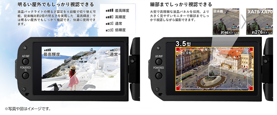 3.5型 約276万ドット相当LCDを搭載。液晶バックライトの明るさ設定が4段階になり従来機比で約2倍の明るさが選択可能です。