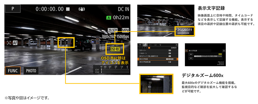 監視用カメラとして活用するのに便利な機能として、「表示文字記録」機能と「デジタルズーム600×」を新たに搭載。検証用途としての利便性を高めます。