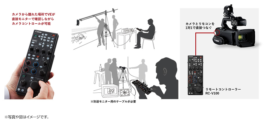 多機能リモートコントローラーRC-V100に対応。画質調整など主要な操作を離れた位置から設定可能で、クレーン撮影など遠隔操作時に活用できます。