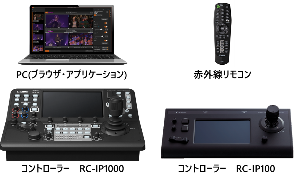 IPコントローラーのRC-IP100、RC-IP1000、赤外線リモコン、PCアプリケーションやブラウザなど、さまざまな方式でカメラのコントロールが可能です。