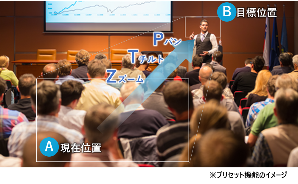 IPコントローラーを使用したPTZ操作(導線)を登録・呼び出しできるトレース機能、特定の画角を登録/呼び出しできるプリセット機能を搭載。