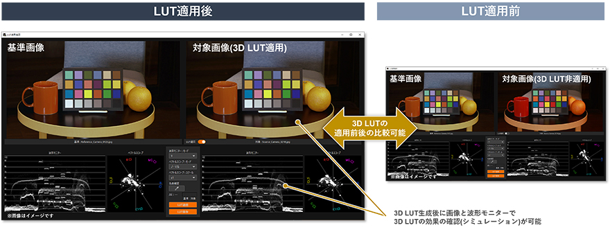 3D LUTの効果確認(シミュレーション)と適用前後の比較が可能です。