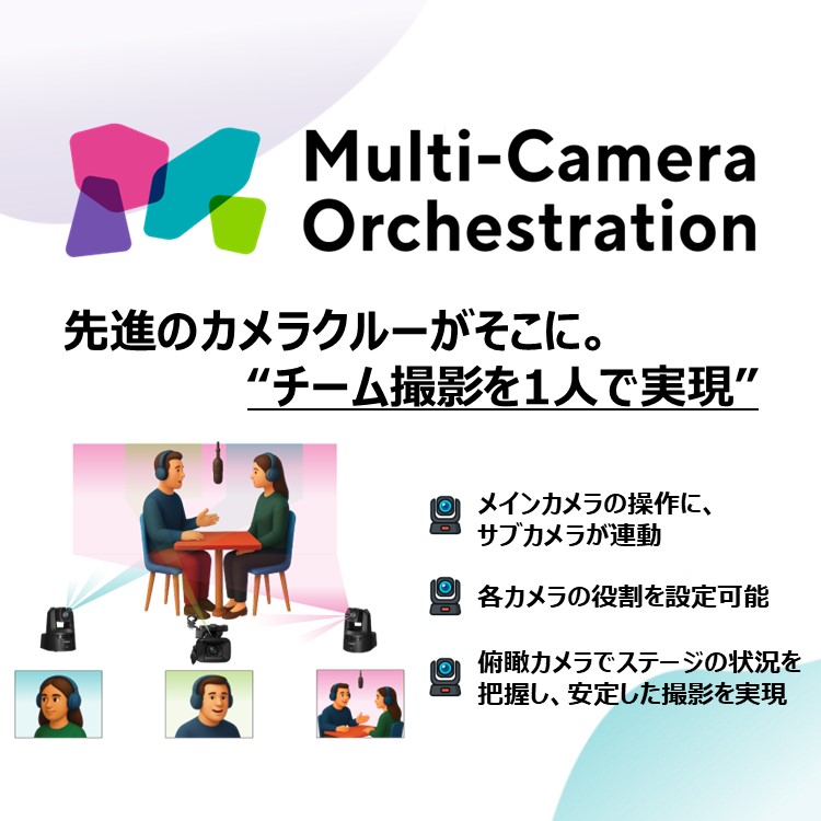 まさに“ひとつのチーム”のように複数のカメラを連動制御できるので、演出の幅が広がるとともに、一体感のあるマルチアングル撮影が可能となります。