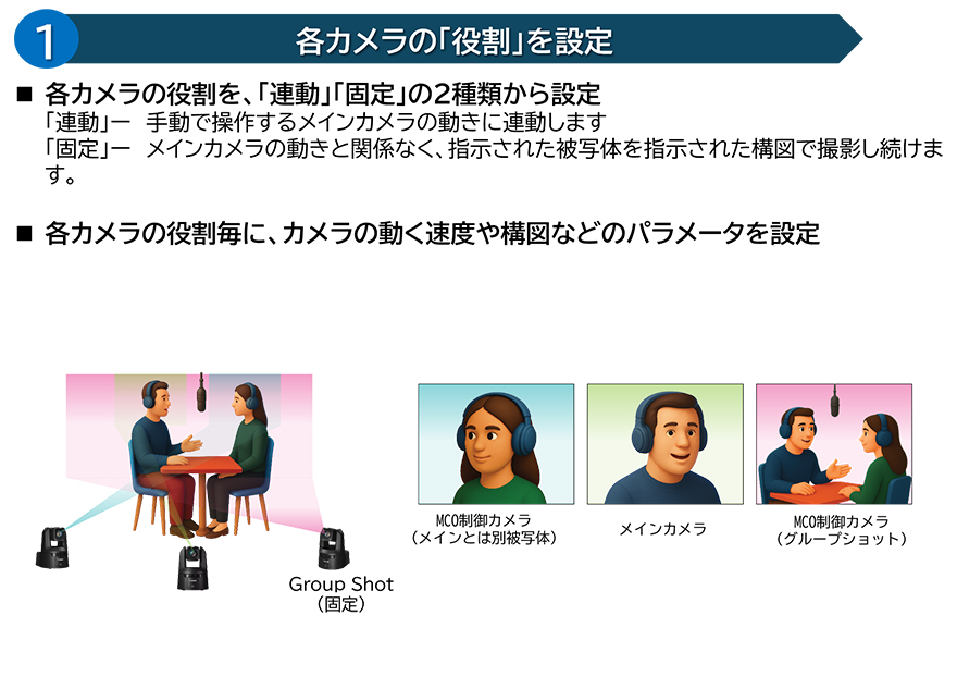 「一番右の人をウエストショットで」など、撮影したい被写体と構図といった各カメラの“役割”を指定できます。また、この“役割”を組み合わせた“役割セット”を設定し切り替えることで、あらゆるシーンに対応できます。