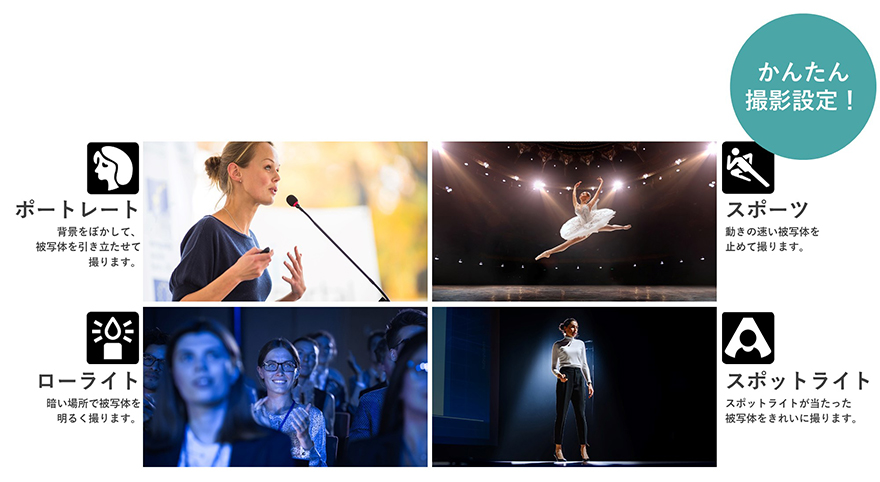 選べる4モードで、撮りたい被写体に適した撮影モードが選択可能です。シーンモードを使用することにより、細かな設定をすることなく撮影ができ、映像制作用途にも使用可能な印象的な映像表現が可能となります。