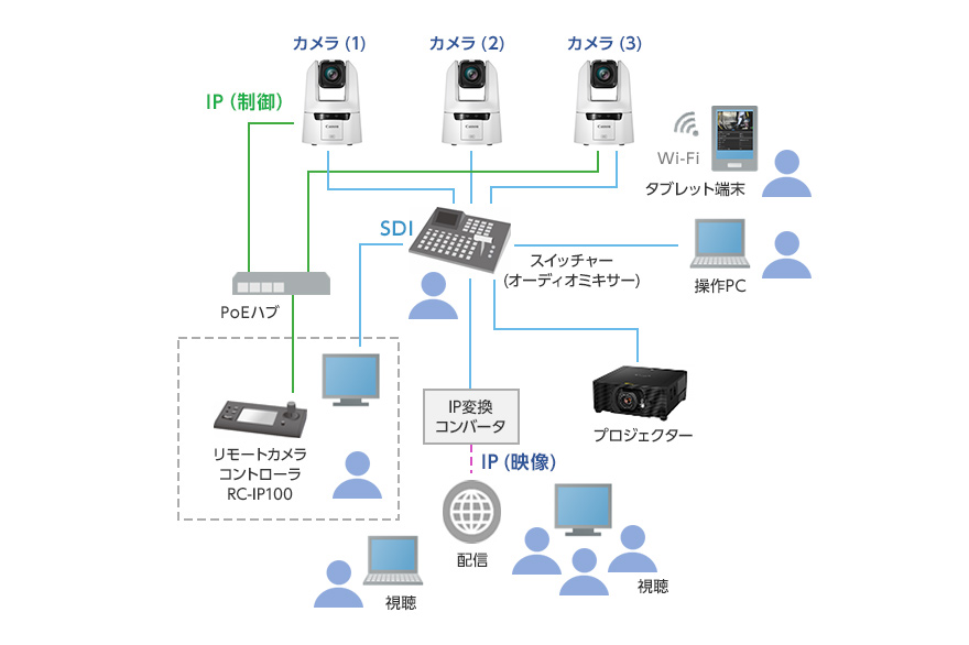 IPで複数のカメラリモートコントロールできるため、少ない人員で撮影ができます。