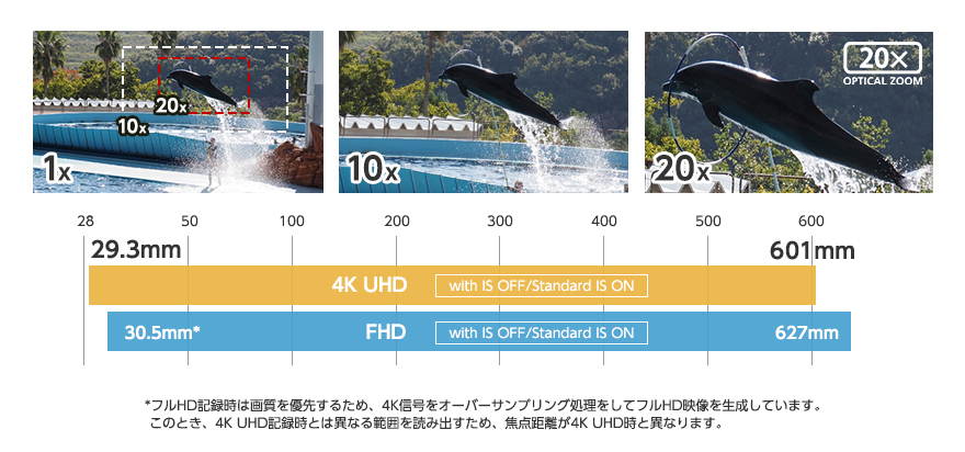オールマイティな用途に使える、35mmフィルム換算29.3mm*からの光学20倍ズームレンズを搭載。