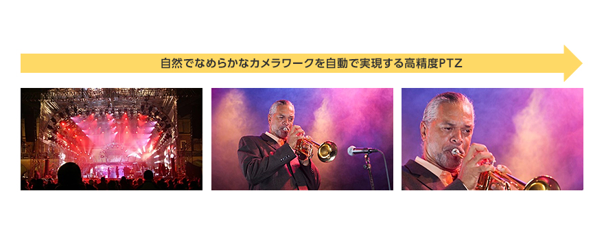 高速から低速まで多段階の速度変化が可能な高精度なPT(パン/チルト)駆動機構とズームを連動させた「スムーズPTZ」を搭載。