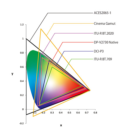 HDTV放送規格ITU-R BT.709やUHDTV放送規格のITU-R BT.2020、デジタルシネマ規格DCI-P3やAMPASが提唱するカラーマネジメント規格ACESの伝送規格ACESproxyに対応し、放送やシネマの映像制作において、広色域映像が持つ色を忠実に再現することができます。