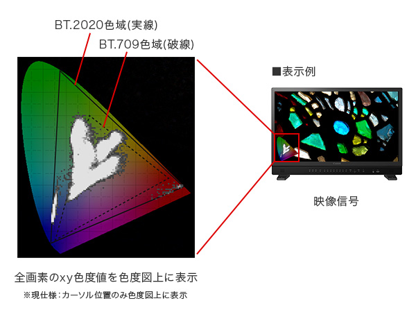 指定したピクセル位置のxy色度値と色度図上の座標位置の表示に加え、入力映像の全画素のxy色度値を色度図上に表示できます。