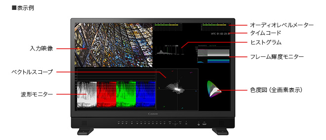 入力映像(1入力のみ)を縮小して表示し、入力映像に重ならないようにタイムコード・オーディオレベルメーター・波形モニター・ベクトルスコープ・色度図・ヒストグラム・フレーム輝度モニターを同時に表示できます。