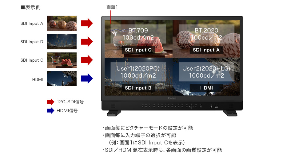 更に4画面に異なる画質設定(ピクチャーモード)ができ、ガンマ(EOTF)や色域など異なる信号フォーマットのカメラ4台のモニタリングができるため、撮影現場での利便性が向上します。また、2画面表示時には、波形モニターやベクトルスコープもそれぞれ表示が可能です。