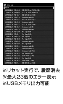 また、電源オフ/オンした場合でも履歴が保持され、エラーは履歴表示やUSBメモリに出力することもできます。