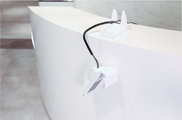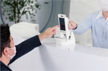受付カウンターなどスペースの限られた場所にも無理なく設置できるコンパクト設計。傾けたり取り外した状態でも操作が行え、背の高い患者様から車椅子の方もスムーズにご利用できます。またカードの置き忘れ防止機能やのぞき見防止機能を備え、大切な個人情報をしっかり守ります。