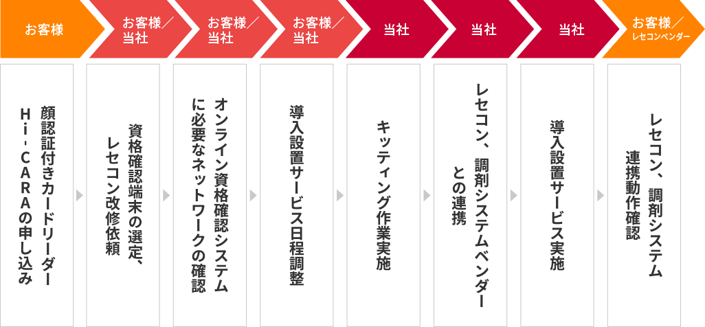 オンライン資格確認環境の構築では、端末の手配設置だけでなく、ネットワーク構築やレセコン、調剤システムベンダー様によるシステム改修、動作確認まで多岐にわたる作業が発生します。当社ではHi-CARAをご手配依頼いただくお客さまに対してご要望に応じて資格確認端末のご手配と導入設置サービスをご提供いたします。