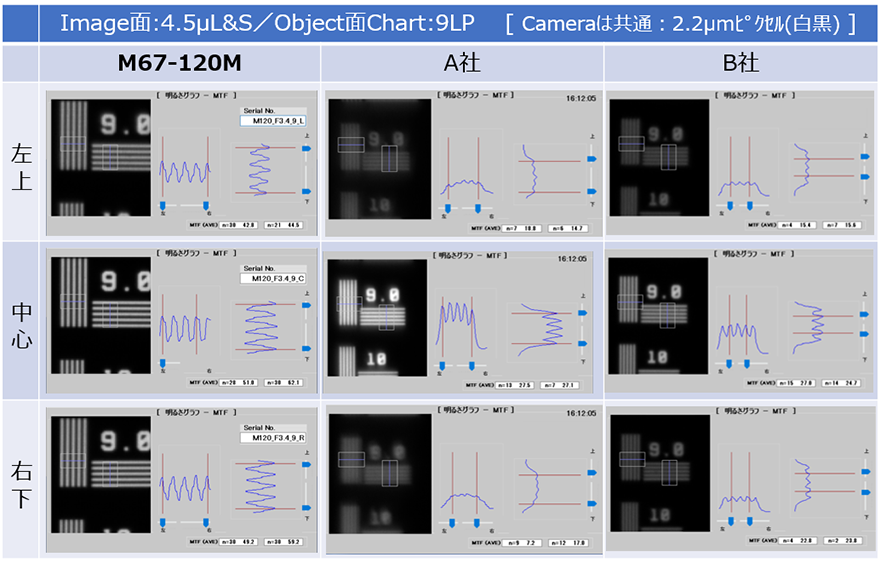 M67-120MAは倍率に応じレンズ群を動かすフローティング設計により、全作動距離において収差を抑制する仕組みになっています。1億2000万画素の超解像度カメラの性能を発揮するために最適なレンズです。