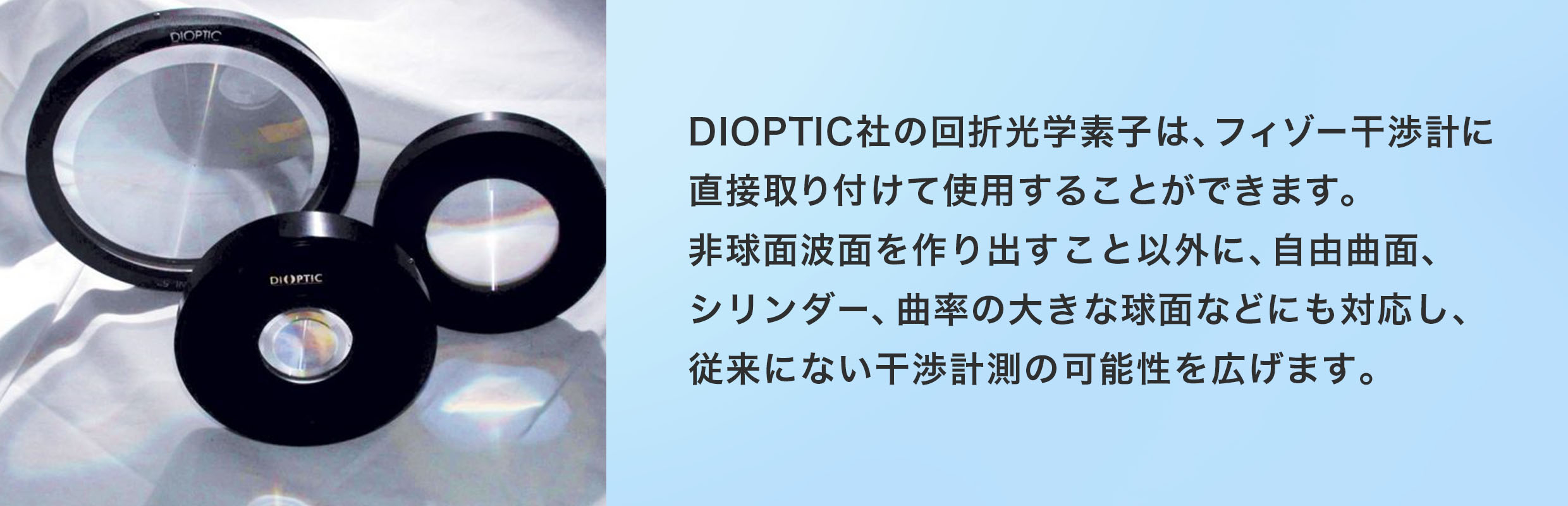 DIOPTIC社は1999年に設立され、光学設計、回折光学素子・赤外線レンズ・光学検査機器の開発・製造・販売事業を展開しております。DIOPTIC社の特許化された回折光学素子Diffractive Fizeau Null Lensはフィゾー干渉計にてTS原器のような使い勝手で非球面計測を可能とします。