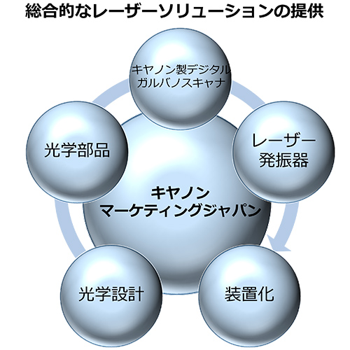キヤノンマーケティングジャパンでは、長年培ったノウハウや経験を活かし、ガルバノスキャナーの販売だけでなく、お客さまの加工ニーズにあった光学部品およびレーザー発振器の提案・販売を行っております。また、光学設計メーカー、システムインテグレーターと連携し、光学ユニットや装置でのご提案も行っております。お客さまのご要望に合わせた最適なレーザーソリューションをご提案をいたします。