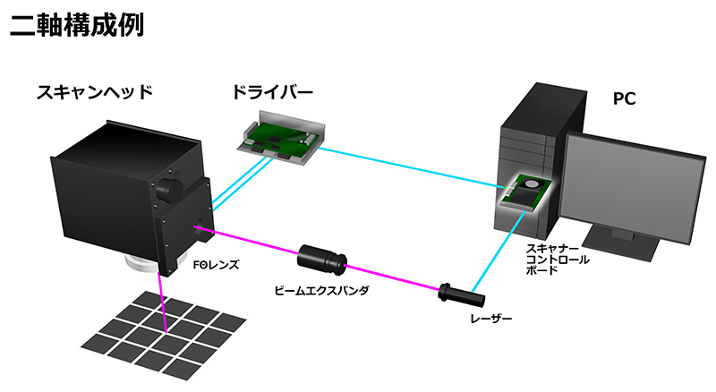 ガルバノスキャナーシステムの構成図となります。ガルバノスキャナーやレーザー発振器、fθレンズ、ビームエクスパンダ等の主要光学部品をこのページでは紹介しております。