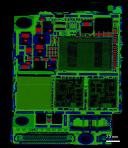 エポキシ樹脂被覆を除去することなく、スマートフォン基板の銅層(緑)の非破壊可視化