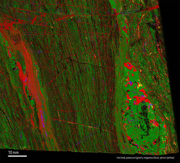 岩石中の希土類(レアアース)元素イットリウム(黄)の元素マップ。他は、鉄(赤)、カリウム(緑)、マンガン(青)に対応。