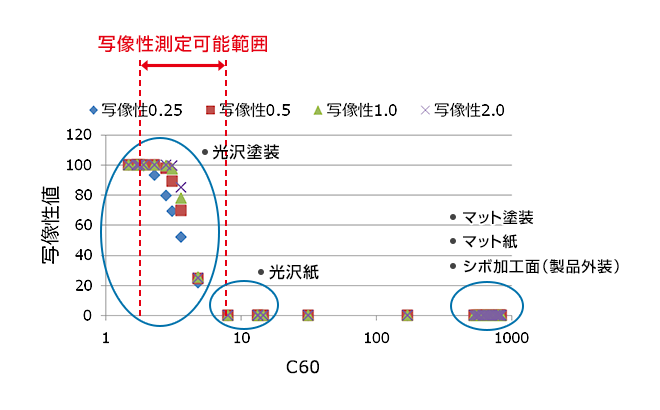 JIS写像性では光沢塗装の一部のみ評価可能。
