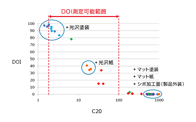 - マット塗装などの拡散面の表面はC20 100~1000間で評価可能。