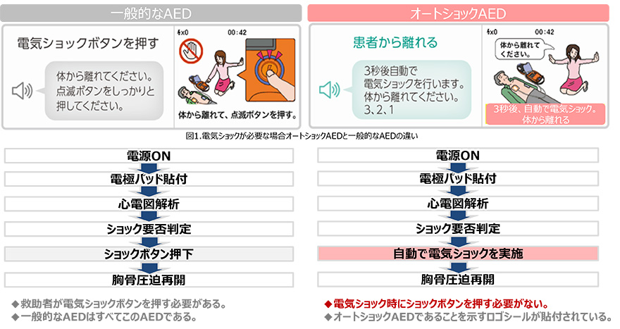 従来のAEDは電気ショックボタンを押す必要があり、不慣れな場合、ためらいや誤操作で処置が遅れることがあります。