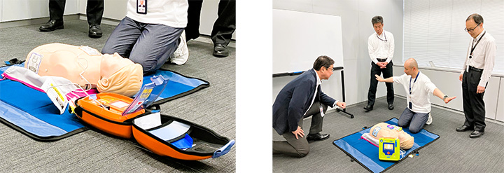 インストラクターがお客さま先へ訪問して、119番通報から人工呼吸・胸骨圧迫・電気ショックまで一連の流れを指導いたします。