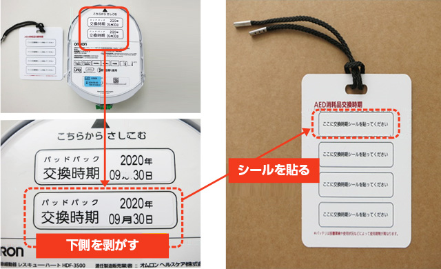 除細動パッドパックの裏面に貼ってある下側のシールを1枚はがし、消耗品交換時期表示ラベルに貼ります。