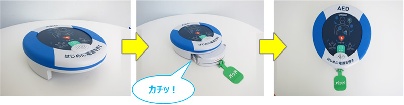AED本体に除細動パッドパックを「カチッ」という音がするまでしっかり挿入してください。
