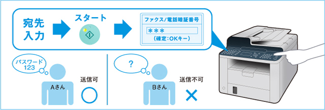 ファクス送信と電話発信の際にパスワード入力画面を表示し、操作できる人を制限できます。