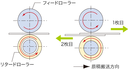 サイズの異なる原稿を複数枚スキャンする際に発生しやすかった斜行搬送を抑止するために、搬送部の左右でそれぞれ独立して回転するフィードローラーを採用。1枚の原稿が斜行すると、先に抜けた側のローラーの回転がストップするため、逆側が抜ける前に次の原稿を引き込んで搬送することがなくなります。