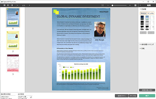 トップ画面の大きなアイコンから、スキャンモード、出力先を選んでスキャンするだけの3ステップで、簡単に使うことができます。