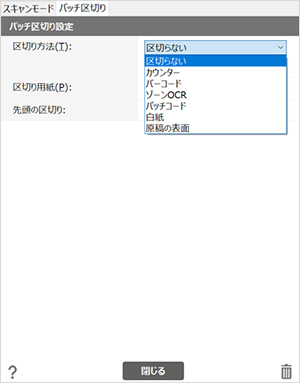 スキャンした画像を自動で区切る方法をスキャンモード設定の「バッチ区切り」タブより6種類の区切り方法から選択できます。