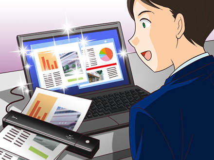 「勉強会や交流会でもらった名刺とか、ほかの人のセミナーで使われた資料の取り込みに便利です。名刺や資料は、もらってすぐにスキャンしてパソコンで整理するようにしています。オフィスに戻ってからだと、整理するのを忘れてしまうことも多いので(笑)」