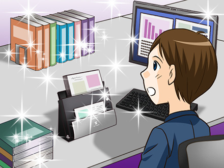 「DR-C225II」を書類整理に活用しているMさん。机上の作業スペースを確保するだけでなく、取り込んだデータをクラウドに保存することで、スマートフォンやタブレットから検索できるようにしている。「DR-C225II」の導入によって、Mさんのお仕事がこれまで以上にはかどることを期待したい。