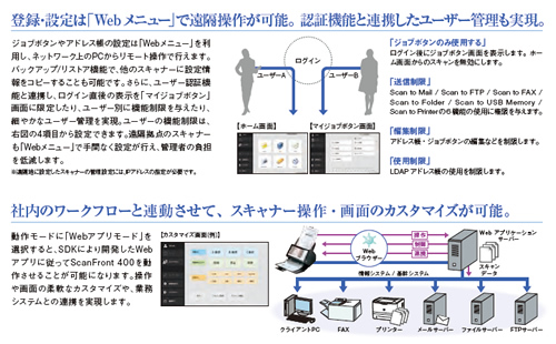 加えて、ScanFront 400はSDK (ソフトウェア開発キット)による開発が可能な「Webアプリケーションモード」を用意している。Webサーバー上のアプリケーションからデバイスの機能を利用できるので、社内ワークフローに最適な形で業務をサポートできる。